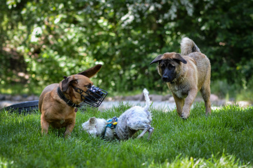 Seit einigen Jahren arbeiten wir hauptsächlich mit Hunden, die ihren Artgenossen gegenüber verhaltensauffällig sind.